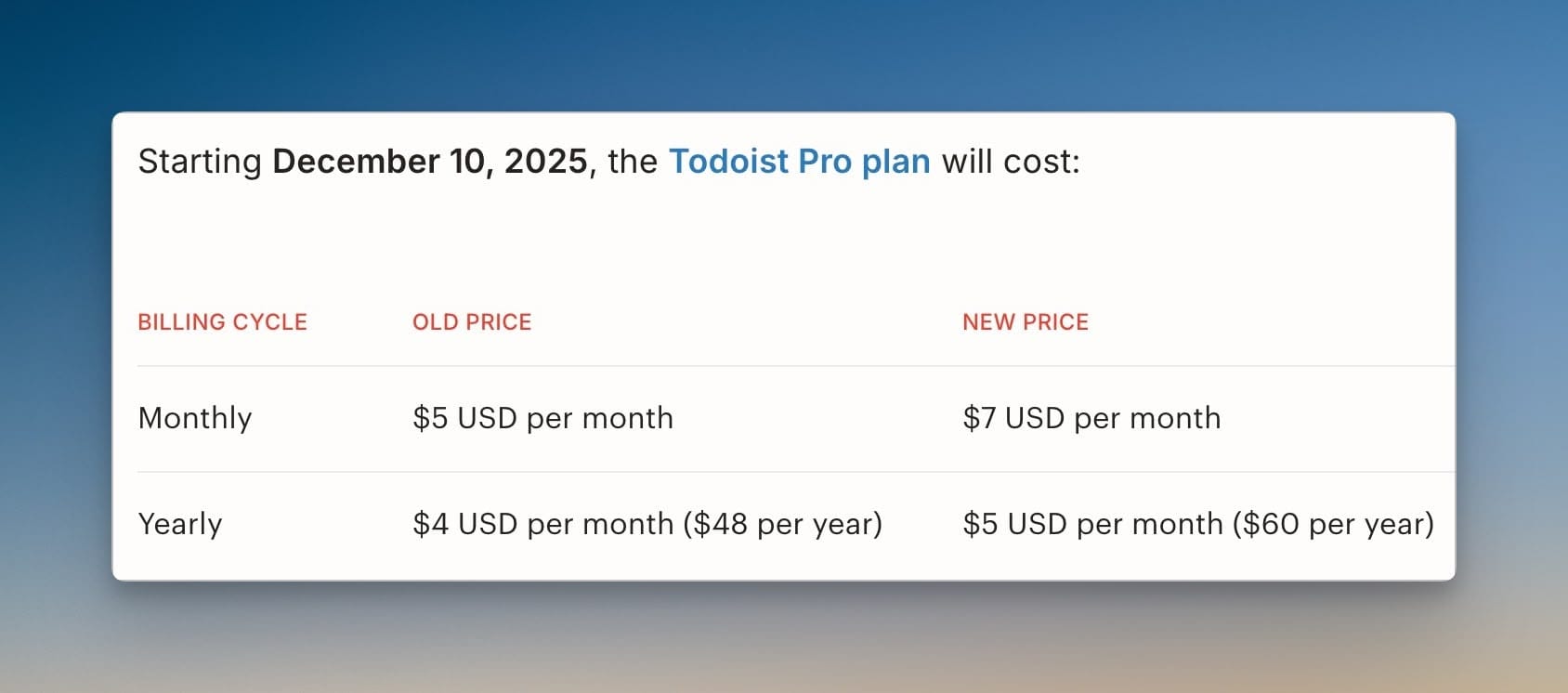Todoist continues to work well for me. I enjoy its design, and it works so well on all platforms. Todoist has increased its subscription pricing from now on. Thankfully, I am grandfathered into the old plan. The downside being, I will not have access to new features. As a customer, this feels unfair but it is the landscape of the SAAS business. If the new features are worth it to me, I obviously, I can upgrade to the current plan.