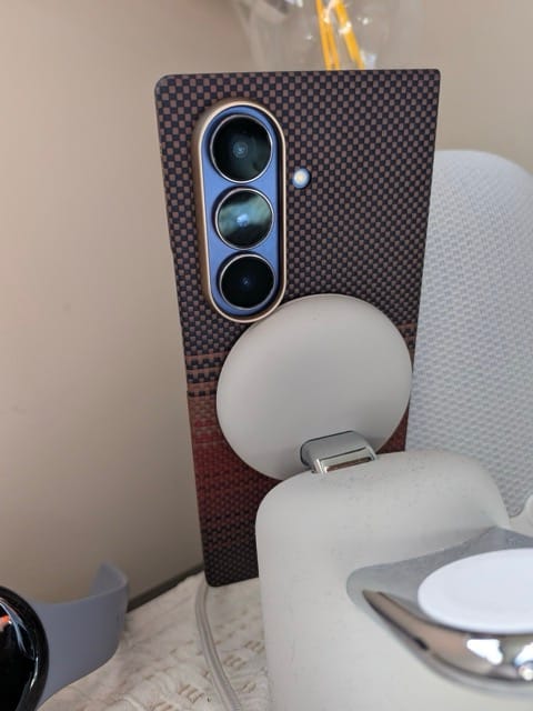 Even with a compatible MagSafe charging case, the MagSafe experience leaves something to be desired for. The magnets on the case are aligned with the Qi charging coil of the phone. This is problematic because the Fold 7 does not sit nicely on the MagSafe charging stand because of the three cameras' horizontal arrangement on the Fold 7.